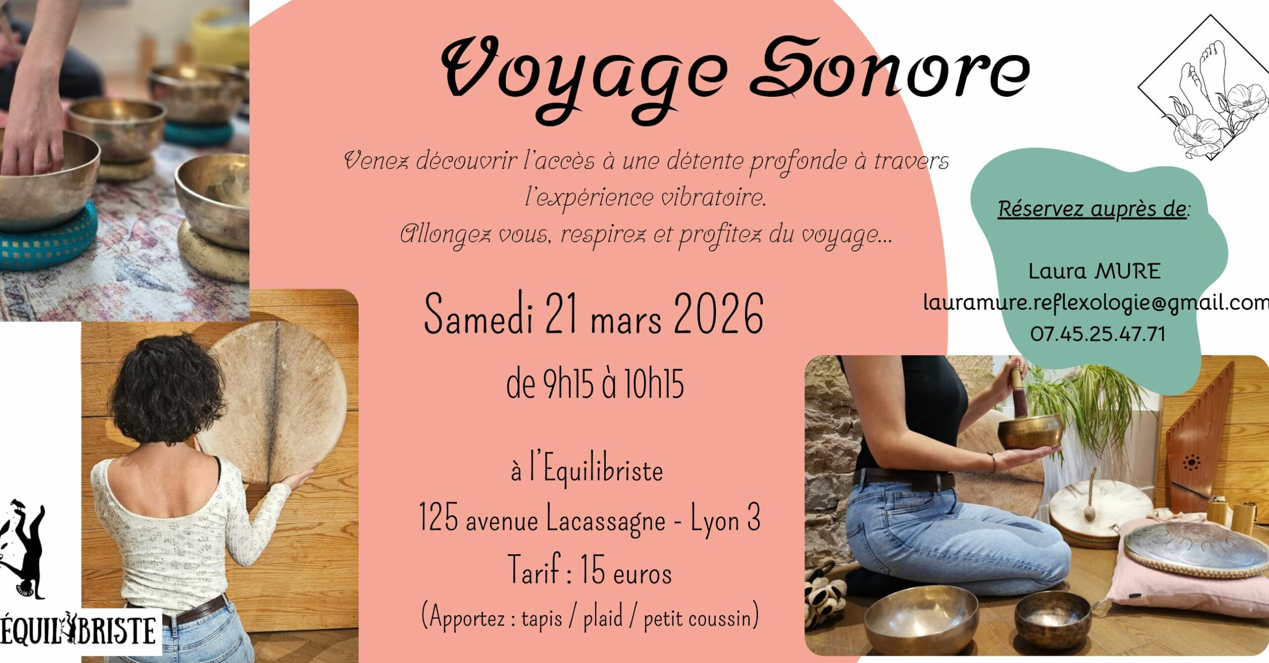 Tarif : 15 euros / Tarif pour les adhérents des Amis de l’Équilibriste : 10 euros Pour l’atelier, comptez une durée de 1h environ incluant des temps de partages (au début et à la fin) et le voyage sonore en lui-même. Réservez dés à présent auprès de Laura: lauramure.reflexologie@gmail.com 07.45.25.47.71